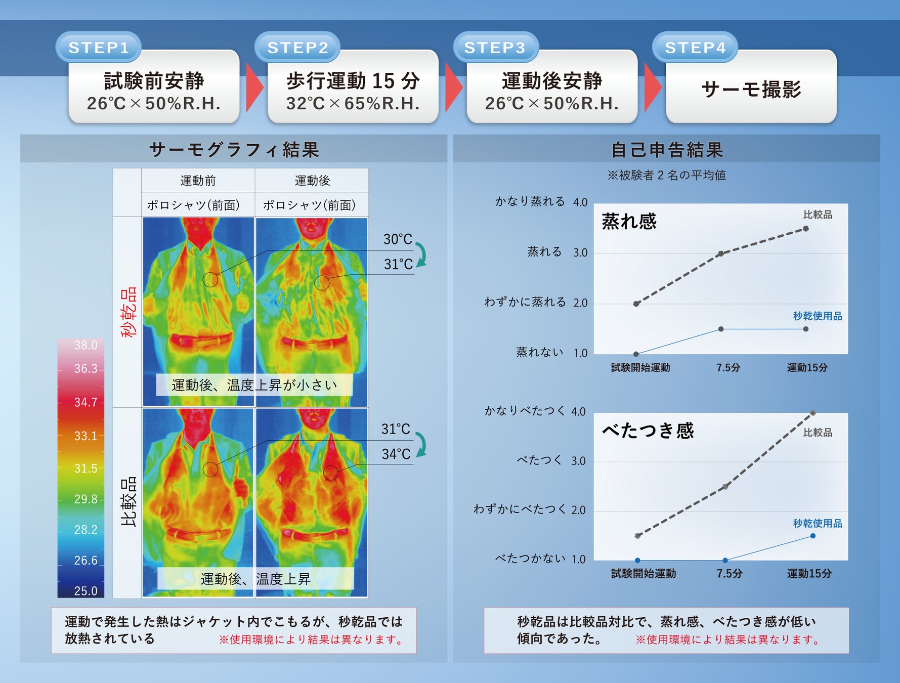 運動後の温度上昇は軽減、蒸れ感・ベタつき感の発生率も低い検証結果となりました。この検証結果からも、気温差のあるこの季節から夏場までジャケットを着用するビジネスパーソンが快適に過ごせるおススメの商品となっています。
