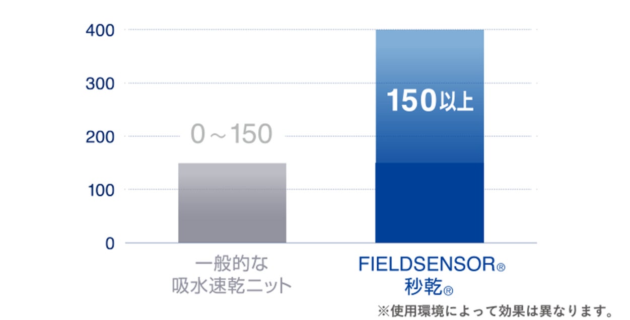 素材は、毛細管現象※2の原理を利用し汗を素早く吸水、拡散、乾燥させる東レ株式会社(本社:東京都中央区)の『FIELDSENSOR®秒乾®』を採用しています。『FIELDSENSOR®秒乾®』は、汗によるべたつき、肌へのまとわりつきなどを感じさせず、サラッと爽快な着心地を実現した高機能素材です。吸水・拡散機能は、従来品と比べ3倍以上の性能(メーカー従来品)でドライ性能も2倍以上と速乾性にも優れています。さらに、洗濯機で丸洗いできるウォッシャブル機能を備えており、夜に洗濯をしても翌日の朝には着用できるなど、いつでも清潔に着用できる高機能ジャケットです。