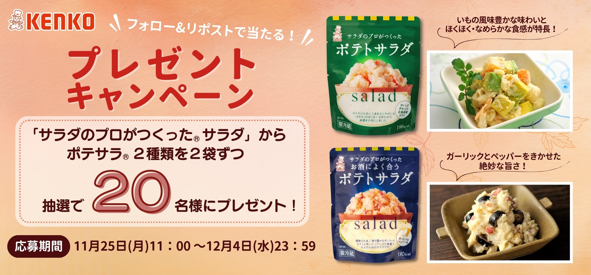 ケンコーマヨネーズ株式会社(東京本社:東京都杉並区、代表取締役社長:島本 国一、以下「当社」)は、日ごろのご愛顧に感謝し、当社公式X(@kenko_mayo)をフォロー&リポストすると、2種類のポテトサラダが当たるキャンペーンを本日11月25日(月)から12月4日(水)まで実施します。