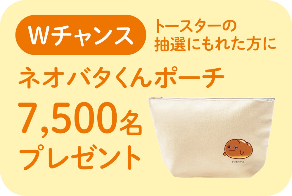 トースターの抽選にもれた方の中から、抽選で7,500名にネオバタくんポーチが当たります。