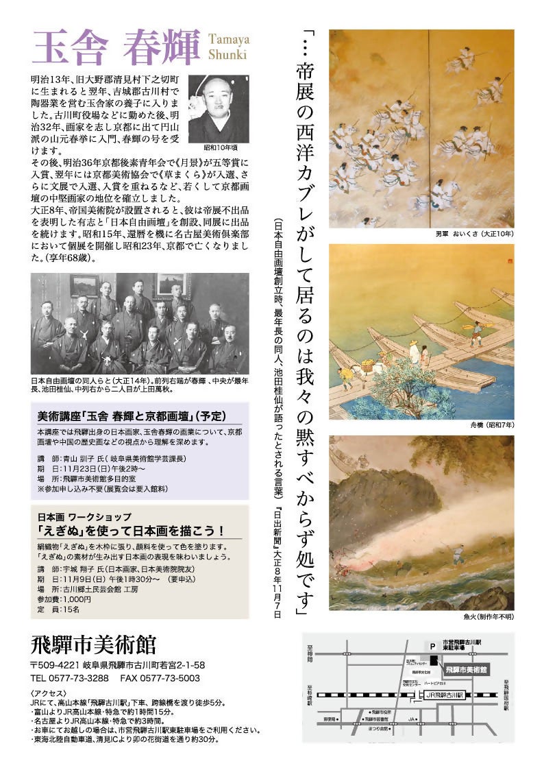 本講座では、飛騨出身の日本画家である玉舎春輝の画業について、京都画壇や中国の歴史画などの視点から理解を深めます。