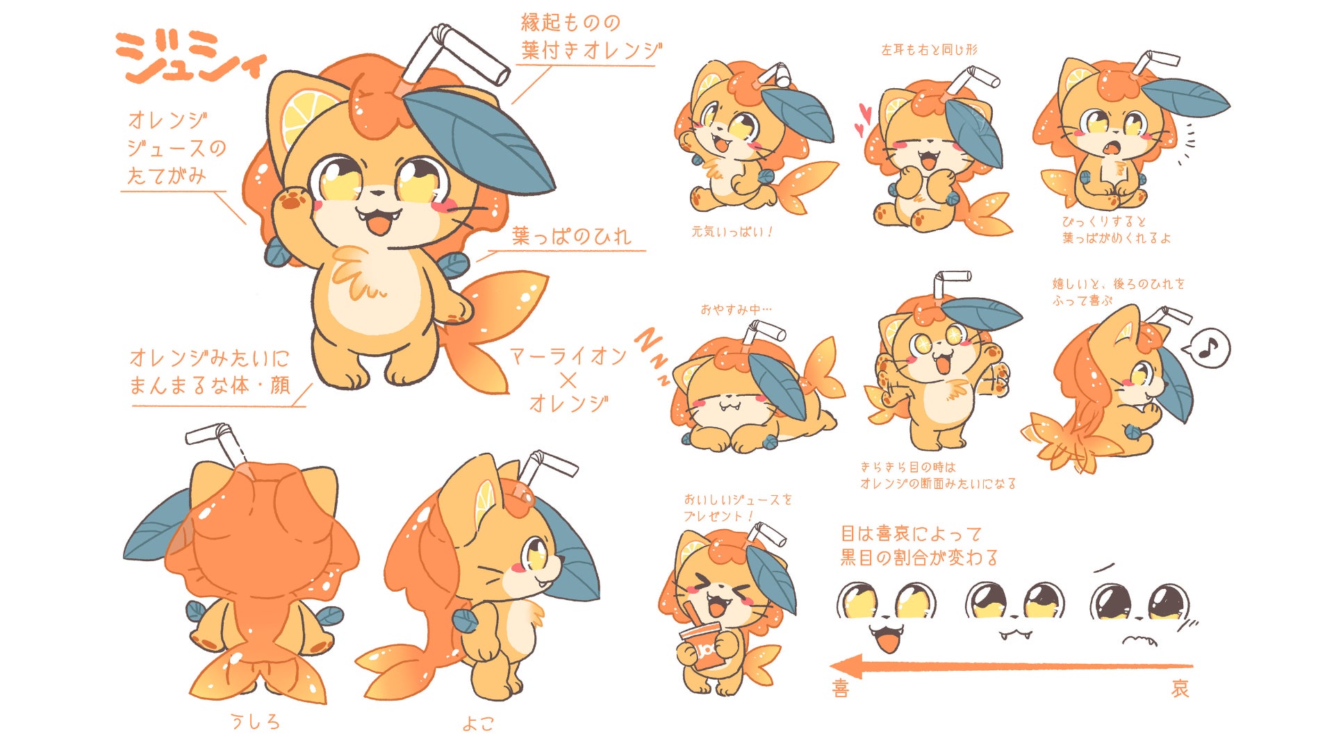 キャラクター名 「ジュジュ」 オレンジの果汁と元気が溢れるようなイメージでデザインしました。 オレンジとマーライオンをモチーフにしています。 立髪は溢れる果汁。 耳はオレンジの果肉。 うるうるジューシーな瞳。 元気なほっぺ。 しっぽは尾鰭のようでハートにも見える形をしています。 みんなに愛されるキャラクターになりますように🙏✨ 肉球は甘酸っぱいオレンジの香り。 コップ型ポーチはイベントで名札として機能します。