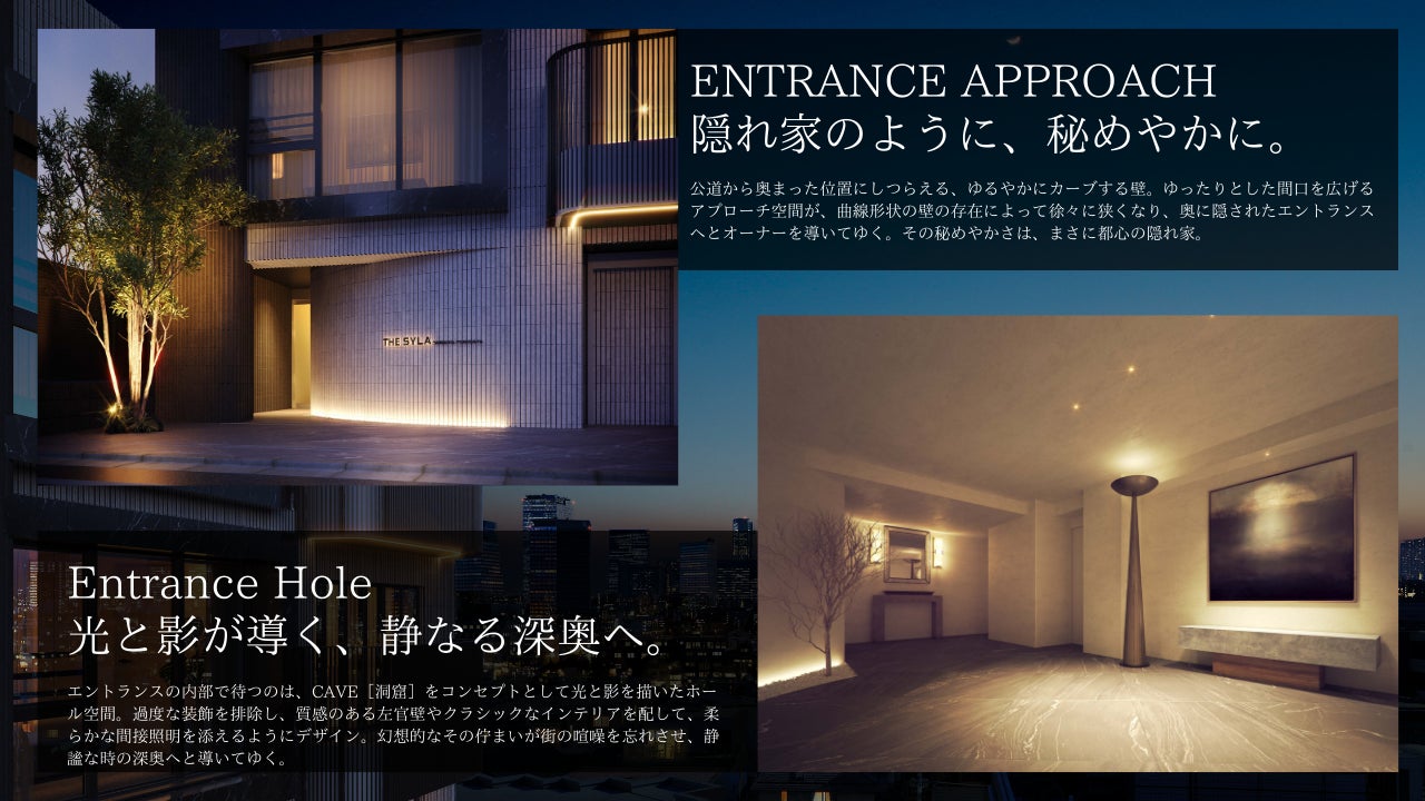 「THE SYLA SHIBUYA-TOMIGAYA」のデザインは、“Classic & Contemporary”をテーマに、時を超えて愛されるラグジュアリーを追求しています。直線と曲線の美しい融合がファサードに表れ、ルーバーやタイルの直線的なラインと、柱やバルコニーの有機的な曲線が優雅な調和を描いています。石調タイルで縁取られたダイナミックな開口部が、洗練された存在感を際立たせ、都市の景観に溶け込みながらもその独自の存在を主張します。物件の配置は、まるで隠れ家のような佇まいを意識しており、公道から奥まった曲線的な壁がゆるやかなアプローチ空間を形成し、住まう人々を静謐なエントランスへと導きます。エントランスホールは「CAVE(洞窟)」をコンセプトに設計され、質感のある左官壁やクラシックなインテリア、柔らかな間接照明が調和した幻想的な空間を演出しています。この空間は、喧騒から解放され、深い安らぎをもたらす場所として、住人に静寂と癒しを提供します。