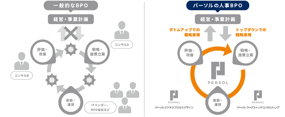 一般的なBPOでは、戦略と運用など各フェーズで事業者が異なり、連携がされないことで「戦略が現場に定着されない」「経営と事業計画とのギャップが生まれる」などの課題がありました。『パーソルの人事BPO』は、経営戦略に紐づく人材戦略の策定や人的資本経営のグランドデザイン設計、人的資本データの収集・活用までのコンサルティングから人事部門全領域の運用支援まで一気通貫で支援することで、戦略の実現につなげます。また課題や環境に合わせた人事部門ごとのBPOサービスも提供し適切なサービスを提案します。