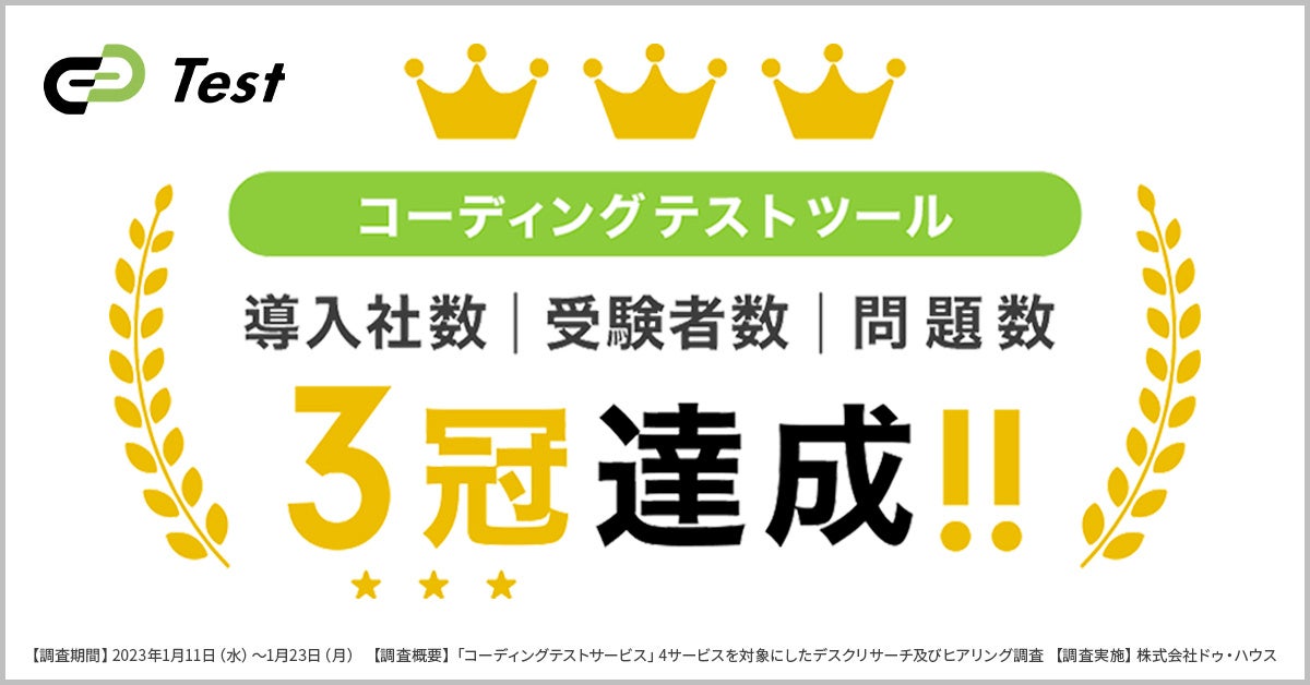 「Track Test」が、コーディングテストに関する調査でNo.1を獲得。「累計導入社数」「累計受験者数」「問題数」の3冠を達成。