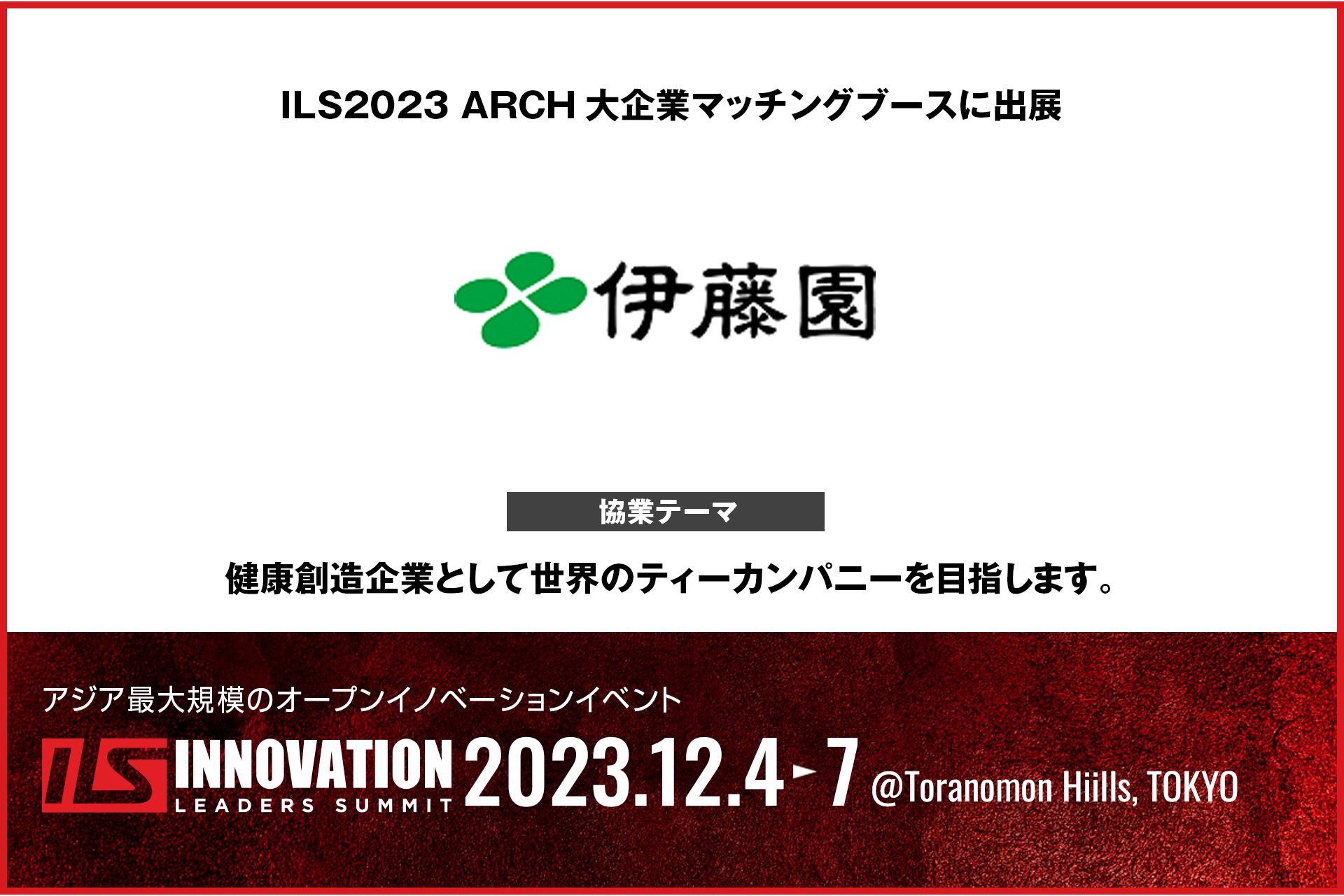 2023年12月4日(月)-7日(木)に虎ノ門ヒルズで開催されるアジア最大級のオープンイノベーションイベント「ILS2023」に、伊藤園が協業マッチングブースを出展します。