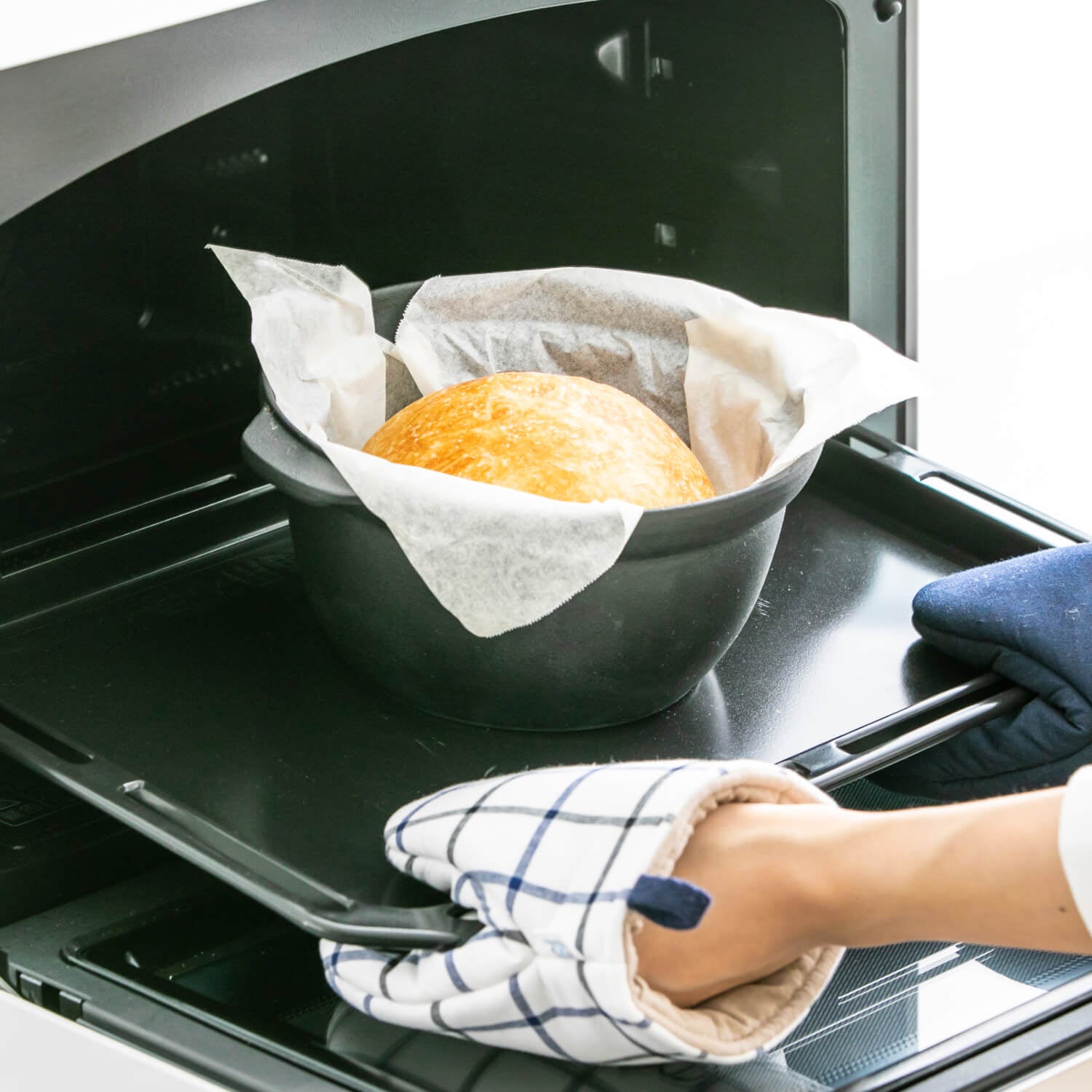 生地を入れ、鍋ごとオーブンで焼き上げると、