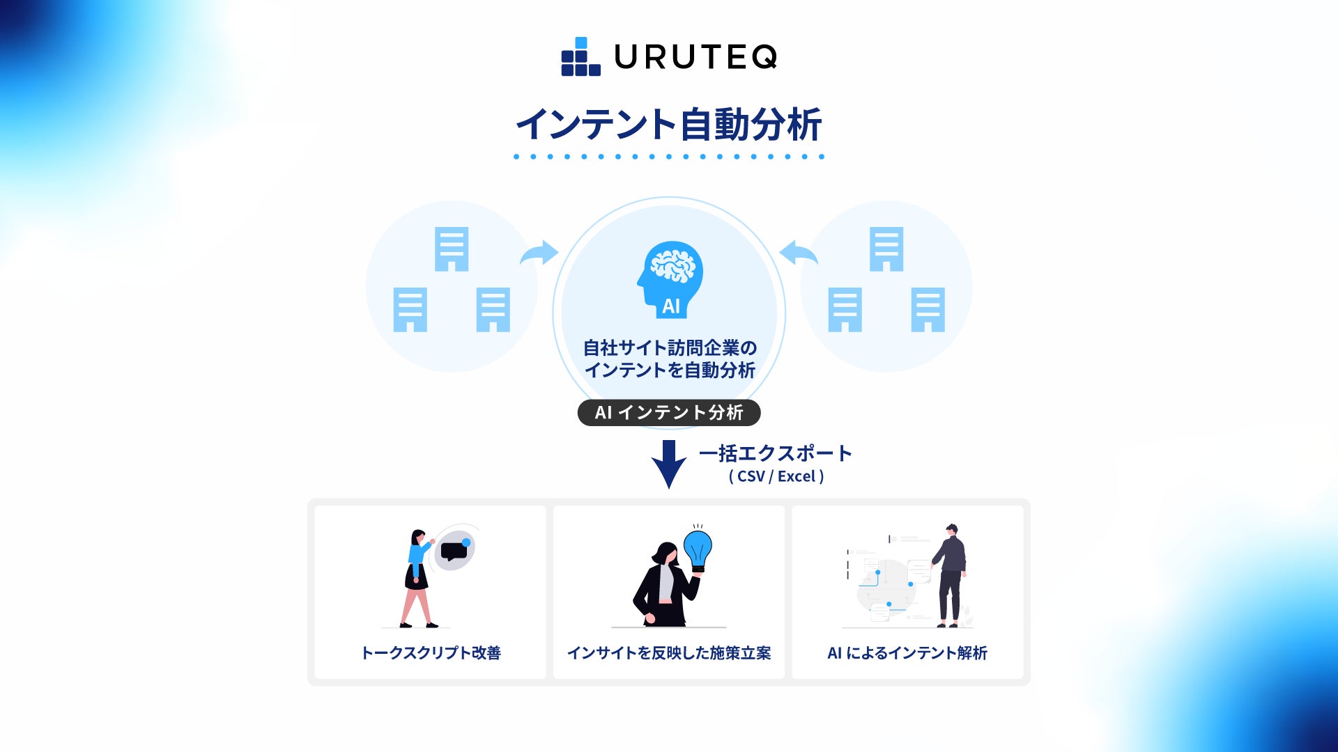 ログリー株式会社(本社:東京都渋谷区、代表取締役:吉永浩和、証券コード:6579、以下、ログリー)が提供するアカウントインテリジェンスツール※1「ウルテク( https://uruteq.logly.co.jp/ )」は、サイト訪問企業のインテント(興味関心)をAIが自動解析し、エクスポートする新機能「インテント自動分析」の提供を2025年5月15日(木)に提供開始します。本機能により企業はサイト訪問者の潜在的なニーズを的確に把握し、顧客インサイトに基づいたコンテンツ戦略の最適化、マーケティング施策の精度向上を実現できます。また、営業活動におけるコミュニケーションの質を高め、データドリブンなDX推進とデータ基盤構築を支援します。