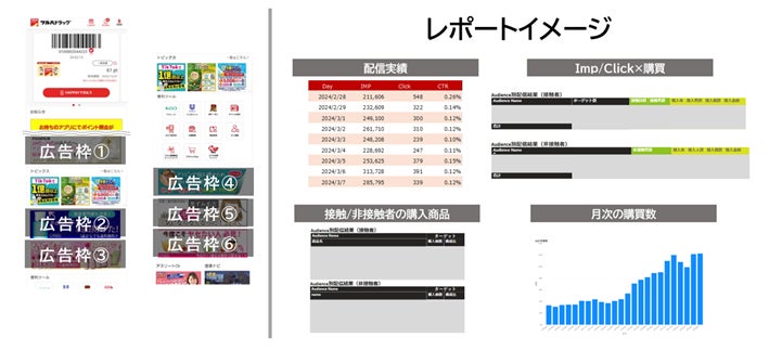 ツルハグループの約1,000万DLされている各事業会社アプリ(ツルハドラッグ、くすりの福太郎など)を活用し、TOPページに新設した6つの広告枠に対して、購買データなど様々なデータを活用し、精度の高い配信が可能になります。また、配信後には購買行動や効果検証を分析するレポートを提供いたします。