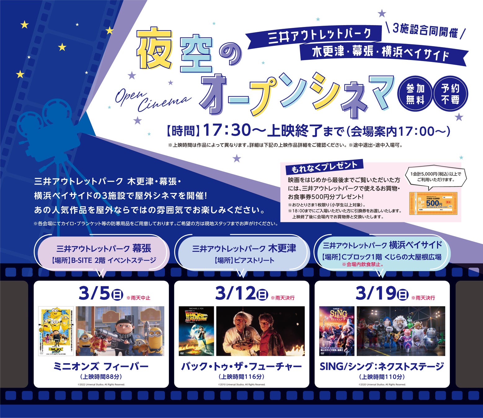 あの人気作品を屋外ならではの雰囲気でお楽しみください。映画をはじめから最後までご覧いただいた方には、もれなく三井アウトレットパークで使用できるお買物・お食事券500円分をプレゼントいたします。