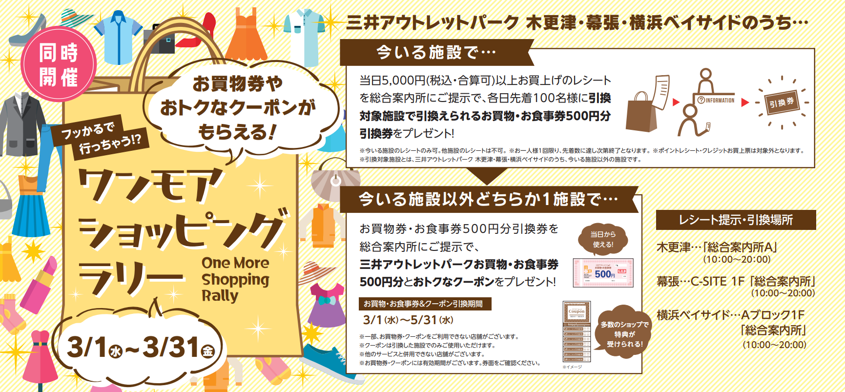 5,000円(税込・合算可)以上お買上げのレシートを総合案内所にご提示いただくと、先着100名さまに、今いる施設以外のどちらか一方の施設で三井アウトレットパークお買物・お食事券500円分がもらえる引換券をプレゼント。