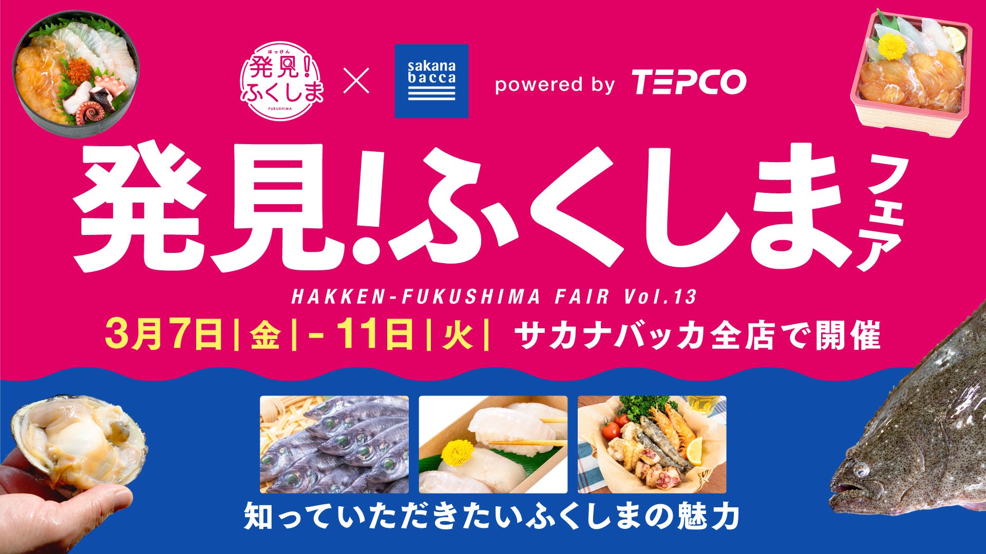 「生鮮流通に新しい循環を」をビジョンに掲げる株式会社フーディソン(本社:東京都中央区、代表取締役CEO山本徹、証券コード:7114、以下 当社)は、2025年3月7日(金)〜 11日(火)の 5日間、東京電力ホールディングス株式会社(以下、東京電力HD)と協業し、当社運営の鮮魚専門店sakana bacca(以下 サカナバッカ)8店舗にて福島県産水産品の美味しさや魅力を発信する「発見!ふくしまフェア」第13弾を開催します。東日本大震災から14年の節目を迎える今回は、「常磐もの」のヒラメやタコを使用した限定丼や加工品を販売し、合計約2,300点の販売を目指します。本フェアを通して、福島県水産物の風評払拭を推進すると共に、福島県の地域活性化・復興支援に貢献してまいります。