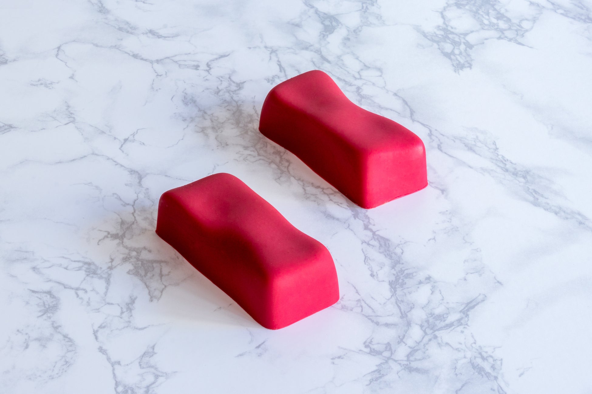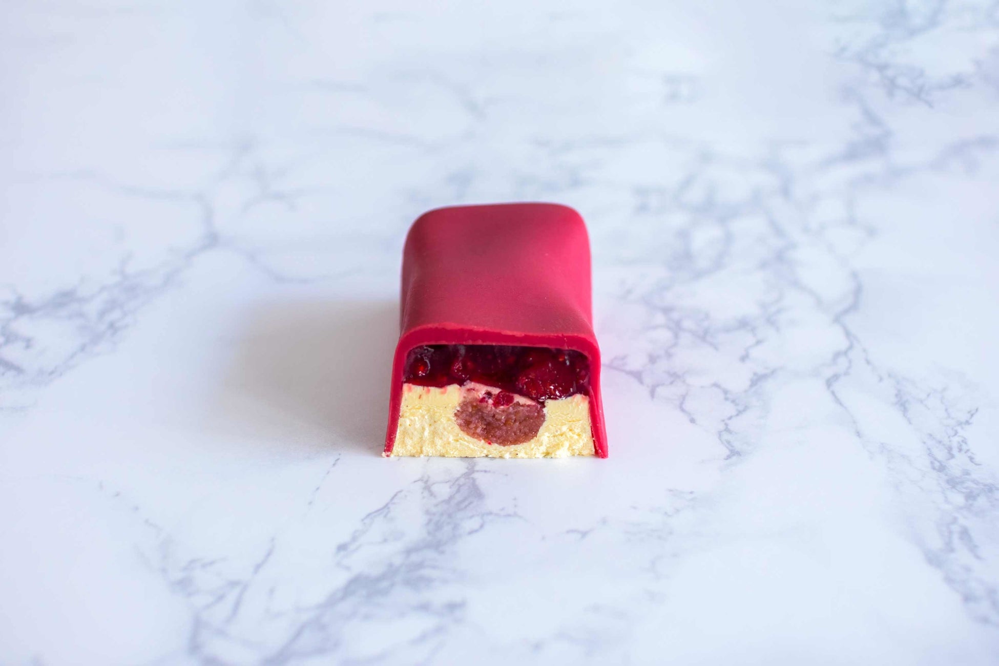フランボワーズの酸味、バタークリームのほのかな甘味、ビスキュイの香ばしさが素材それぞれの口溶け温度帯の時間差で口内に広がるバターケーキで、色鮮やかなバターチョコレートのシェルの中にコンフィチュール、ビスキュイ、バタークリームが収められています。色鮮やかですが着色料・香料を使用していません。