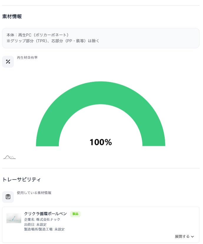 また今回のマテリアルリサイクルの取り組みでは、TBMの提供するトレーサビリティ情報等を付与した再生材や再生原料の調達プラットフォーム「Maar 再生材調達」のDPP※に適応した事項の可視化機能を活用し、再生材含有率や、原料から再製品化までのトレーサビリティを可視化するなど、将来的なDPP対応を見据えた消費者への環境性、循環性の訴求に取り組みました。