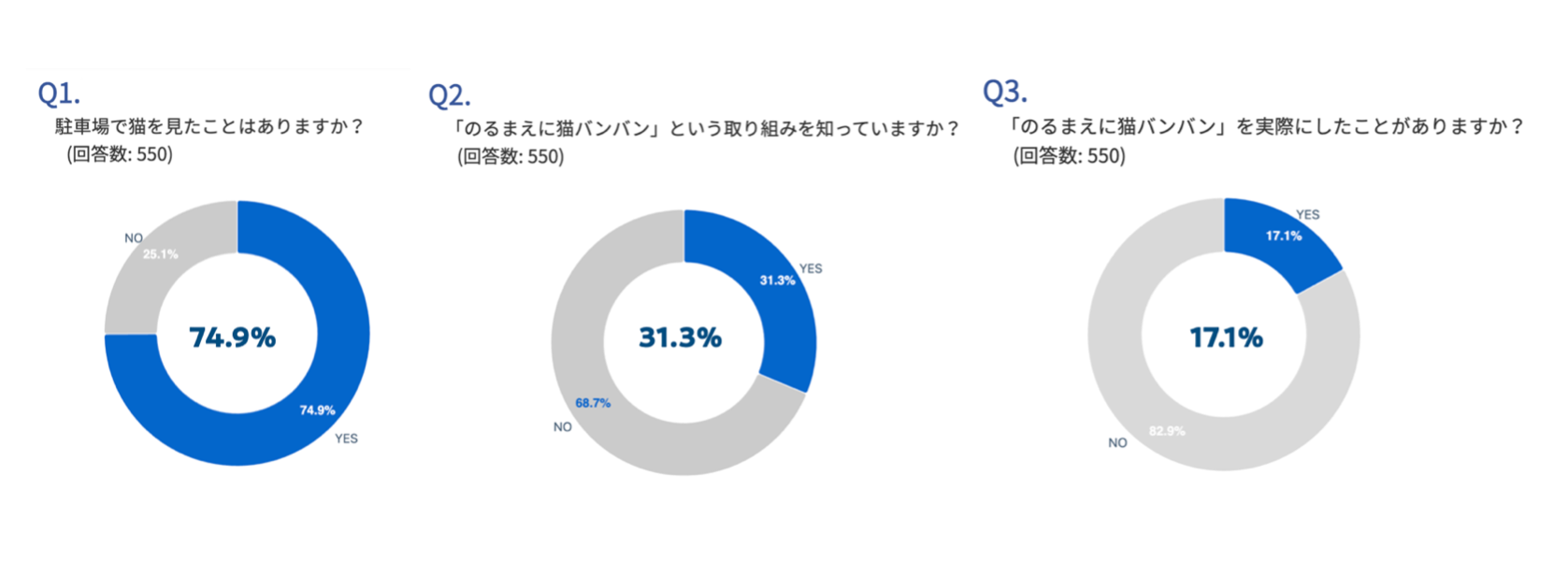 実際にドライバーの74.9%が「駐車場で猫を見たことがある」と回答する中で、実際に猫バンバンを知っている」と答えた方は31.3%、さらに「猫バンバンを実施したことがある」と答えた方は17.1%にとどまり、まだまだ認知が及んでいないこと、そこに起因して実際に猫を守る行動までは繋がっていないことがわかりました。そこで、多くの方と一緒に、より簡単に地域の猫を守っていくべく、「#もっとひろがれ猫バンバン」を実施します。