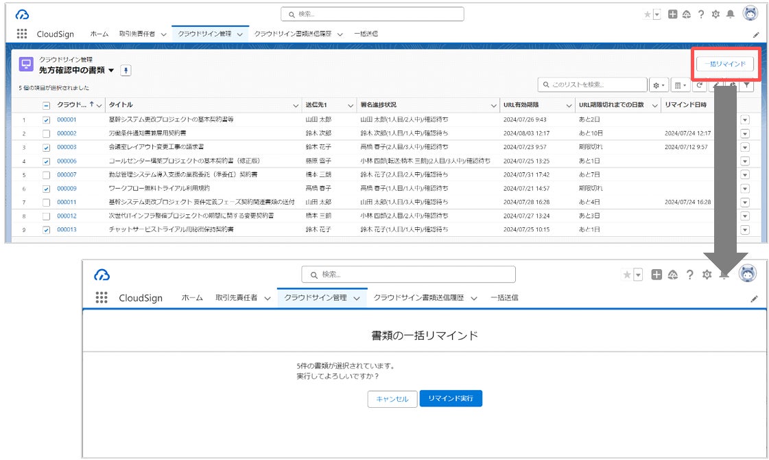 送信済み書類のリマインドを一括で実行できる機能が追加されました。これまでは書類の確認を完了していない送信先に対し、一件ずつリマインドを行う必要がありましたが、この機能追加によりリマインド対象を選択して一括して送信できるため、効率的にリマインドを行うことができます。