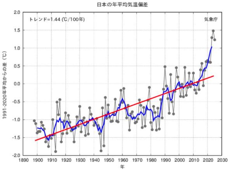 気象庁のデータによると、1991年~2020年の年平均気温を基準とした場合、近年では+1℃を超える上昇傾向にあり、大人の思い出の夏とはもはや別世界の暑さになっています。