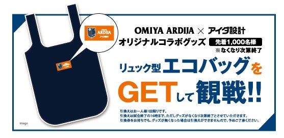 この度、アイダ設計は「大宮アルディージャ vsレノファ山口FC」へプレゼンツマッチパートナーとして協賛いたします。当日はアイダ設計プレゼンツマッチを記念してアイダ設計公式LINE@にお友だち登録している方先着1,000名様を対象に、アイダ設計×大宮アルディージャオリジナルコラボデザインのリュック型エコバックをプレゼントいたします。さらに大宮アルディージャへの熱い応援メッセージの投稿で、サイン入り公式試合球やレプリカユニフォームが当たるInstagramキャンペーンも実施いたします。