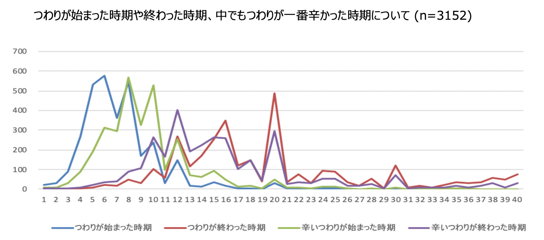・4週目から始まる人が多く、終わるタイミングは20週が最も多い
