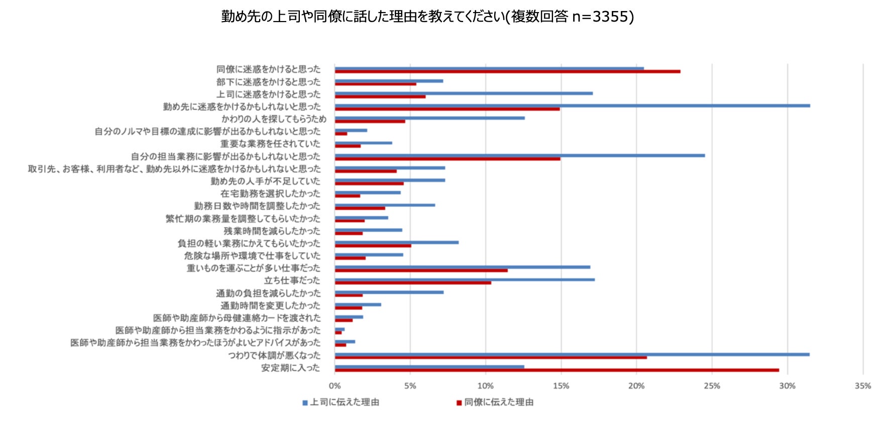 上司に伝えた理由は「つわりで体調が悪くなった」「勤め先に迷惑をかけるかもしれない」「担当業務に影響がでると思った」など、同僚に伝えた理由は「安定期にはいったから」「同僚へ迷惑をかけると思った」などの理由が上位になりました。