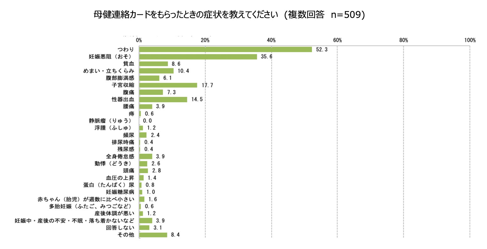 また、主治医等が行った指導事項の内容を、妊産婦である女性労働者から事業主へ的確に伝えるためのカード「母健連絡カード」の認知度は高いものの、あまり活用されていないことがわかりました。また、母健連絡カードをもらっている人の症状は、つわりが52.3%、妊娠悪阻が35.6%、ついで子宮収縮という結果でした。
