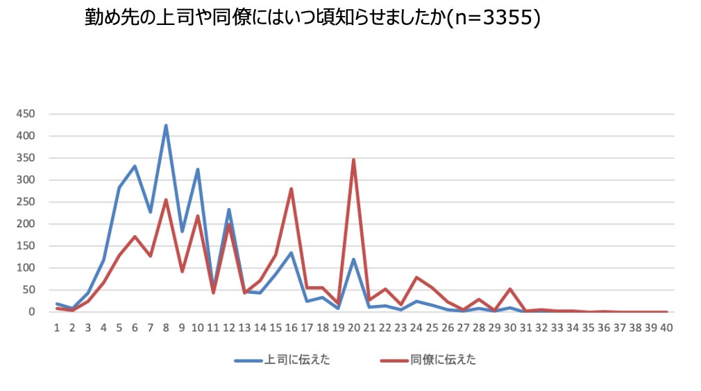 妊娠に関する報告を上司や同僚に伝えたタイミングは個人差があるものの、上司と同僚とでは伝える時期が異なる傾向があり、上司には妊娠初期に、同僚には妊娠初期から中期(安定期)にかけて伝えている傾向でした。