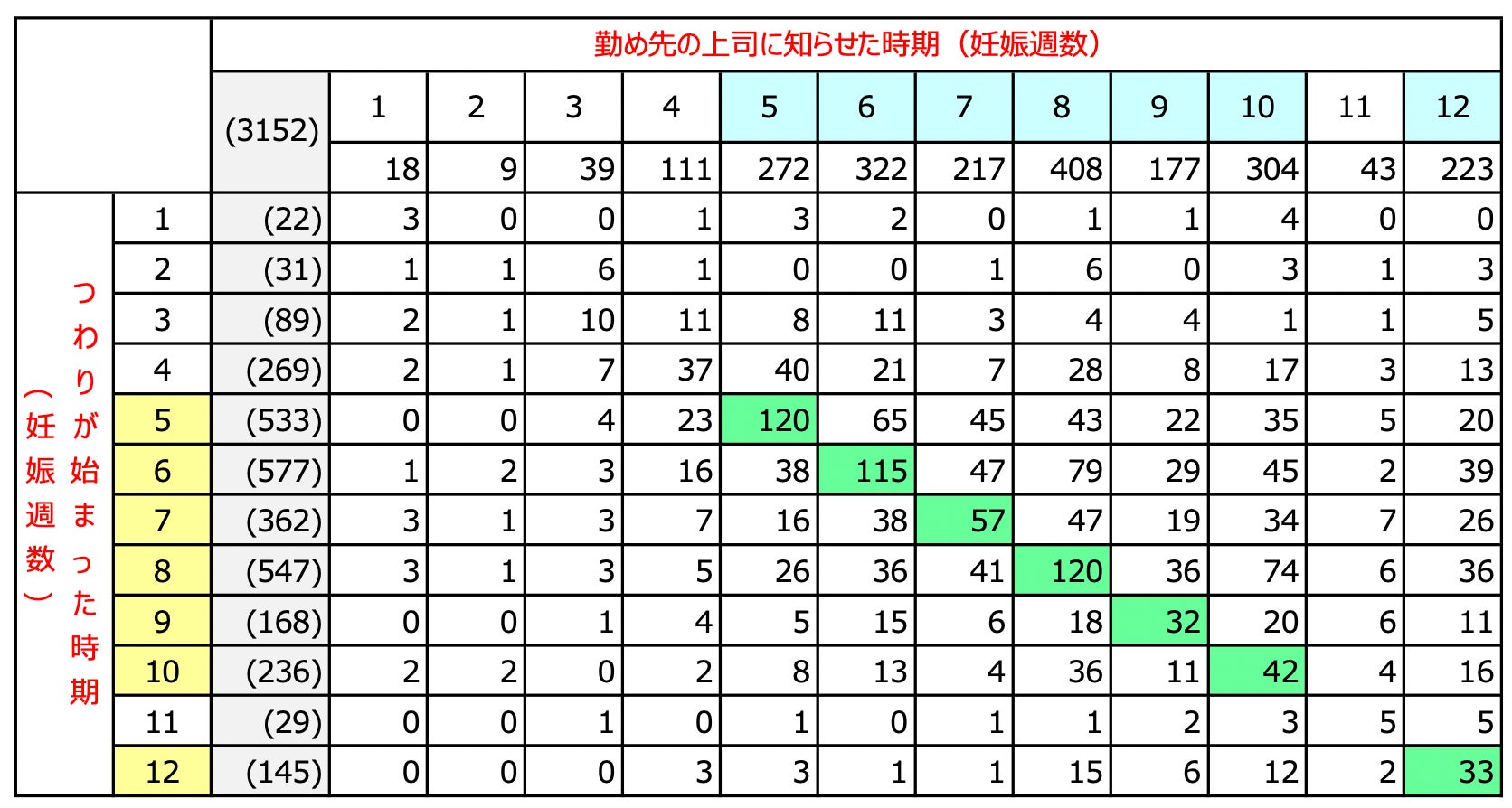 ・つわりの始まりと上司に妊娠を情報共有するタイミングが一致する傾向がみられ、