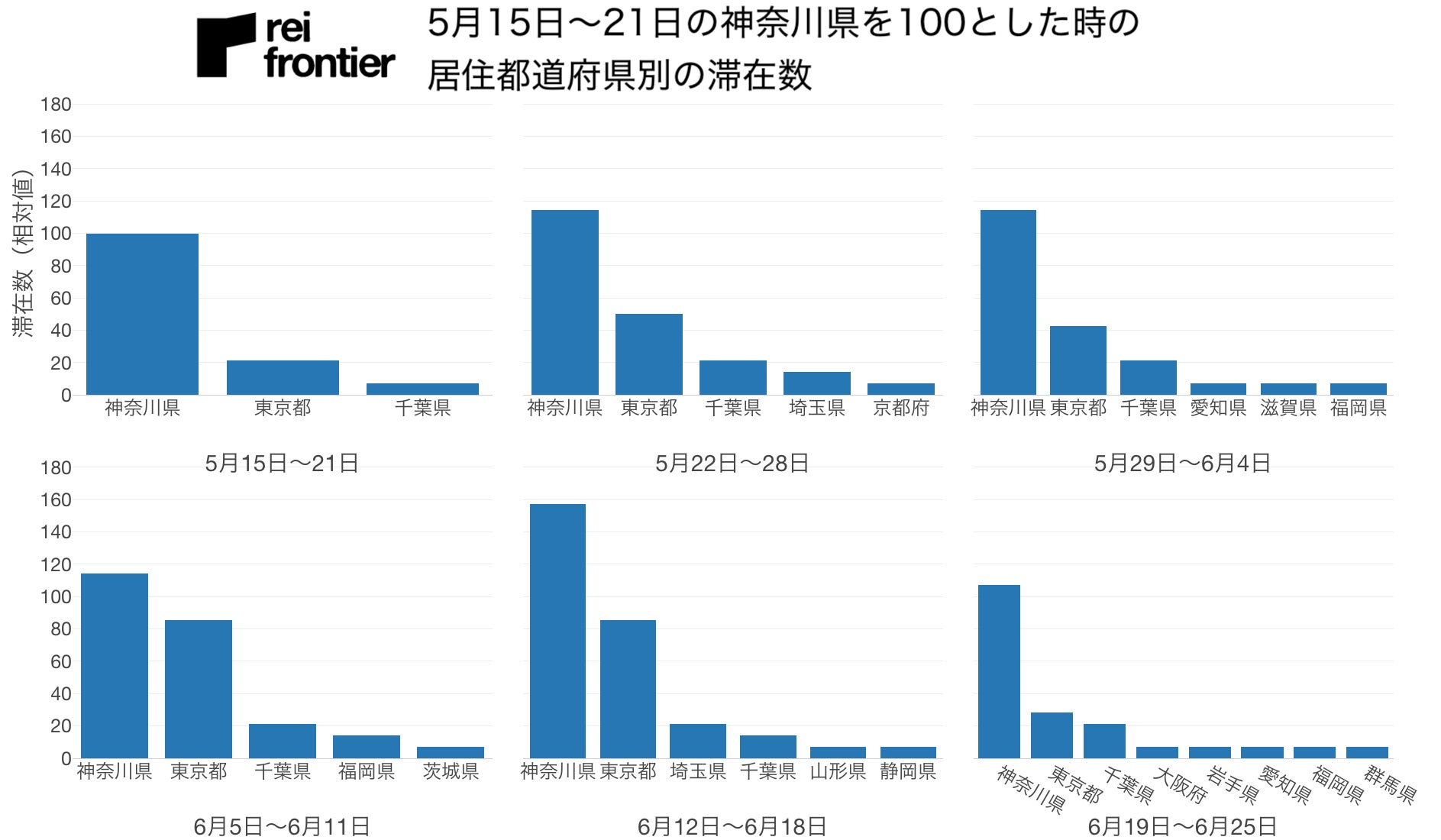 5 月 15 日〜21 日の神奈川県居住の人の滞在数を 100 とした時の、訪れた人の居住都道府県の人数を示しています。