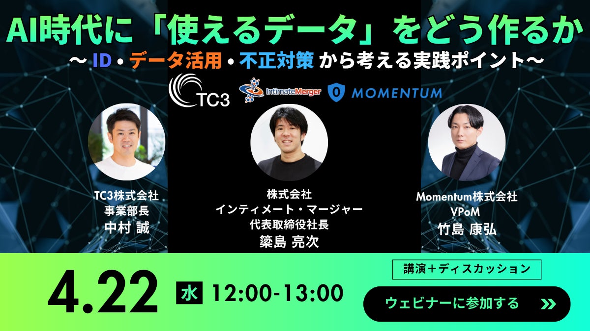 Momentum株式会社(本社:東京都港区、代表取締役社長:細井康平)は、2026年4月22日(水)に開催されるセミナー「AI時代に『使えるデータ』をどう作るか 〜ID・データ活用・不正対策から考える実践ポイント〜」(主催:株式会社インティメート・マージャー)に登壇することをお知らせいたします。
