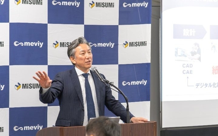 冒頭、吉田より今回のイベントについて、「meviyの2つの革新のうち、より重要である『デジタルものづくり』の仕組みについて公開する初めての機会となる。ぜひ楽しみに見ていっていただきたい」と述べ、製造業の課題から、産業界の持続的発展のためにmeviyが担う社会的存在価値やミッションなどについて話しました。また、遠矢からは「ミスミ生産方式」をはじめとするミスミが培ってきたデジタルものづくりの進化について説明しました。
