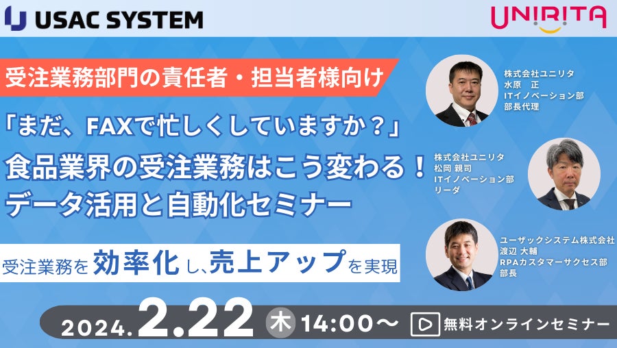 業務プロセスの自動化・効率化を支援するユーザックシステム株式会社(本社:大阪市、代表取締役社長:小ノ島 尚博、以下 当社)は、株式会社ユニリタ(本社:東京都港区、代表取締役 社長執行役員 北野 裕行、以下 ユニリタ)と共催で、ビジネス環境の変化が激しい食品業界に向け、デジタル化やデータ活用が課題となっている受注業務の効率化をテーマにしたオンラインセミナーを開催します。2024年2月22日(木)14:00 オンライン開催で、参加は無料です。
