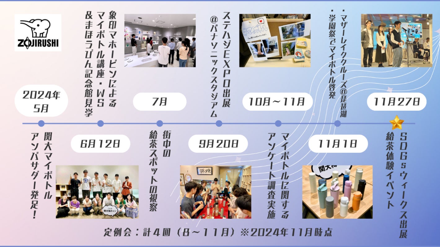 同プロジェクトを推進するのは「関大マイボトルアンバサダー」の学生たち。現在約20名で活動しており、発足して約半年で以下の実績を積み上げてきました。学生たちは象印マホービンの全面協力のもと、月一回の定例会を通じて、マイボトル普及に向けた課題の洗い出しから、解決に向けたアイデア出し・企画立案、イベント実施と、着実にPDCAサイクルを回しています。