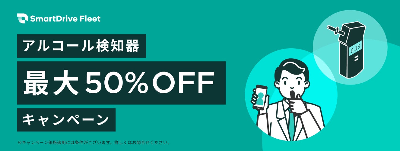 今回のキャンペーン期間中お申込みいただいた下記対象の企業様に限り、当社のクラウド型車両管理システム「SmartDrive Fleet」を導入する際のアルコール検知器購入費用が最大半額となり、費用を抑え、お得に利用を開始していただくことが可能となります。