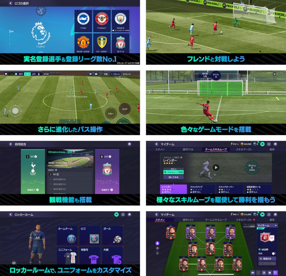 『FIFA MOBILE』では、本物のクラブや選手を使って自分だけのオリジナルチームを作り、11対11のオンライン対戦はもちろん、ゴール数を競う「VSアタック」、昇格・降格ありの本格的なリーグ戦を体験できる「シミュレーションリーグ」、戦術や指示を駆使してリーグ昇格を目指す「マネージャーモード」、各種スキルゲームなど、お好みに合わせて多彩なコンテンツをお楽しみいただけます。また、背番号を含む多彩なカスタマイズが可能な「ロッカールーム」機能で、自分だけのチームを作ることもできます。