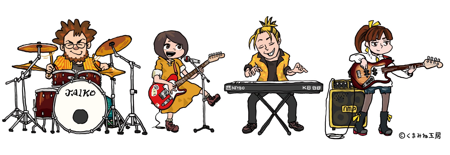 本イベントのポスターやチラシのメインビジュアルは、「仕事猫」シリーズで知られるイラストレーター・くまみね氏が担当。普段は動物のイラストを中心に手がけるくまみね氏に、今回は特別に人物画を依頼しました。ギターボーカル、ベース、キーボード、ドラムの4人組バンドを描き、「みんなで楽しむライブイベント」というコンセプトを表現しています。くまみね氏らしいポップであたたかみのあるタッチで仕上げていただきました。