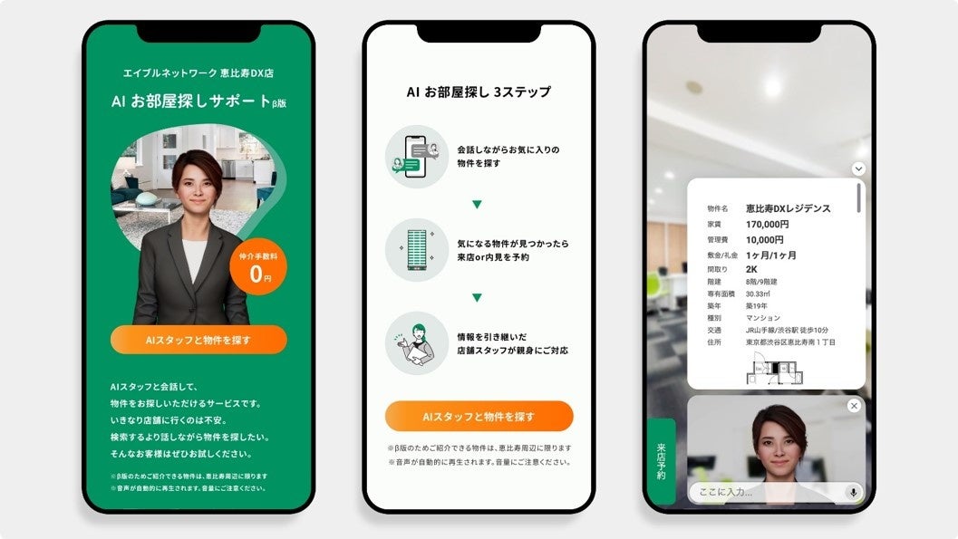 株式会社エイブル(本社:東京都港区、以下エイブル)は、ネットワーク店舗(フランチャイズ加盟店舗)として恵比寿に拠点を構える、エイブルネットワーク恵比寿DX店(デジタルトランスフォーメーション Digital Transformation:DX)にて、生成AIとデジタルヒューマンを活用した賃貸仲介サービスのトライアルを開始しました。