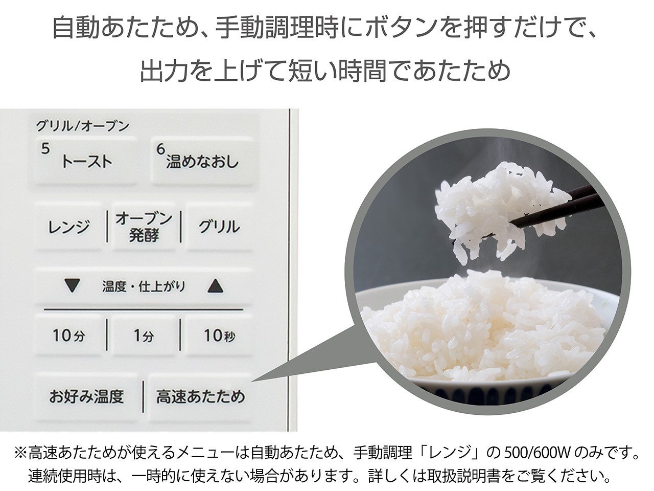 ・高速あたため機能搭載。自動あたため、手動調理時にボタンを押すだけで、出力を上げて短い時間であたため。