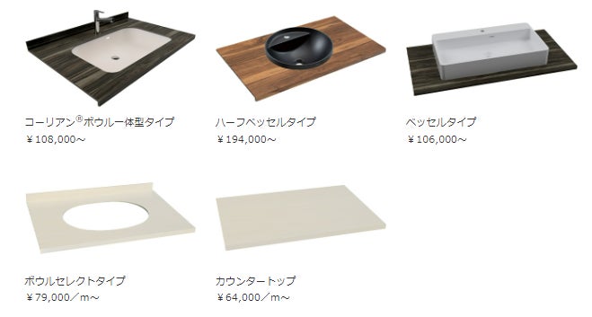 商品ラインアップは計5種。コーリアン®ボウル一体型タイプでは人工大理石を40年以上取り扱っている当社の加工技術を用いて、バイオマーブルとコーリアン®のシームレス接着を可能とし、汚れが溜まりにくく衛生的なボウル一体型タイプを実現しました。他にも、当社取り扱いボウルをセットしたタイプやお客様のお好みのボウルがセットできるように開口加工した洗面カウンター、またカウンタートップもご用意しました。施工箇所にあわせて1mm単位でのサイズ指定も対応可能です。