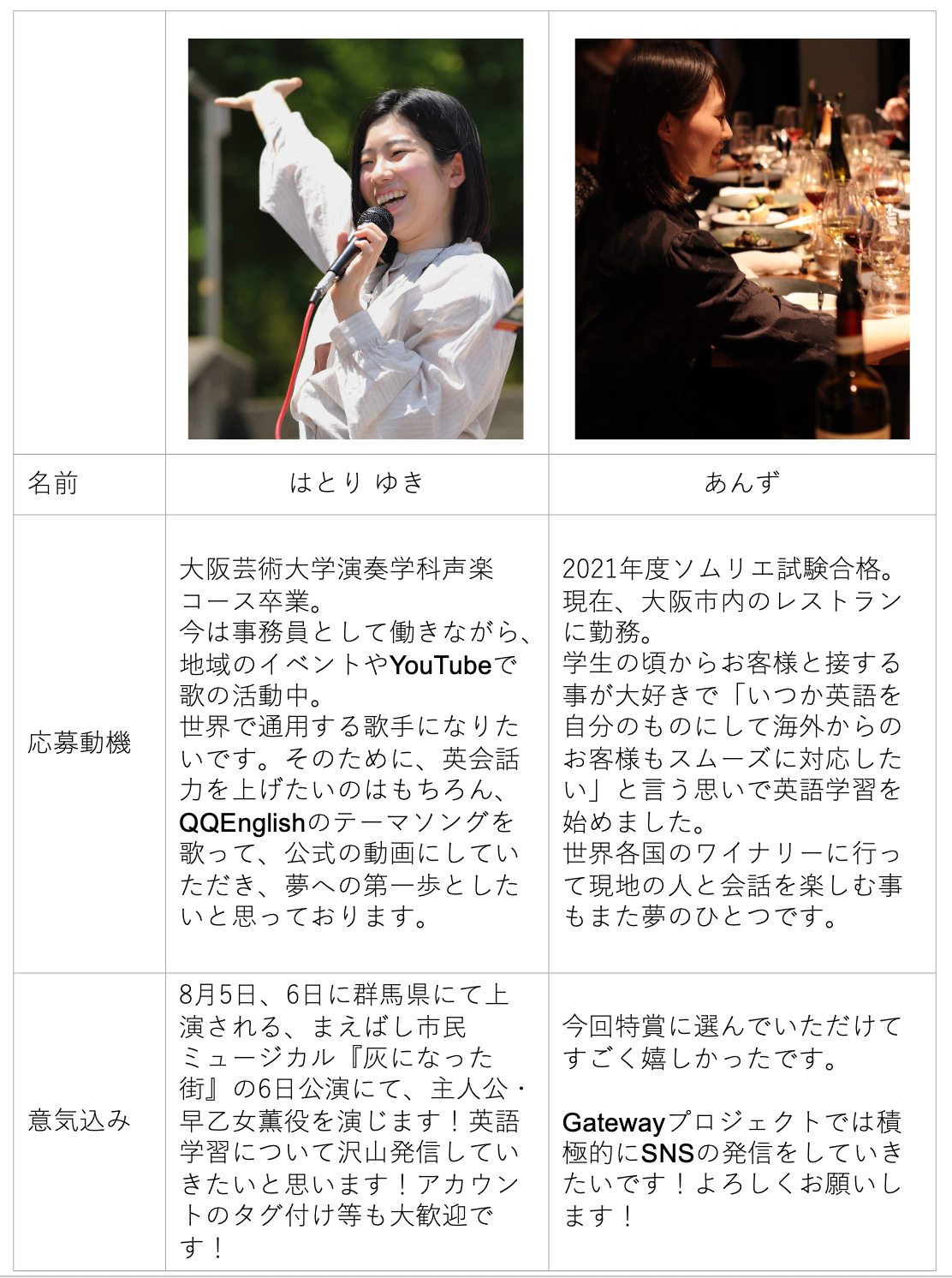 意気込み | まえばし市民ミュージカル『灰になった街』の8/6公演にて、主人公・早乙女薫役を演じます。英語学習について沢山発信していきたいと思います! | 今回特賞に選んでいただけてすごく嬉しかったです。 GatewayプロジェクトではQQEnglishさんの魅力、英語学習の楽しみなど、積極的に発信をしていきたいです!よろしくお願いします! |