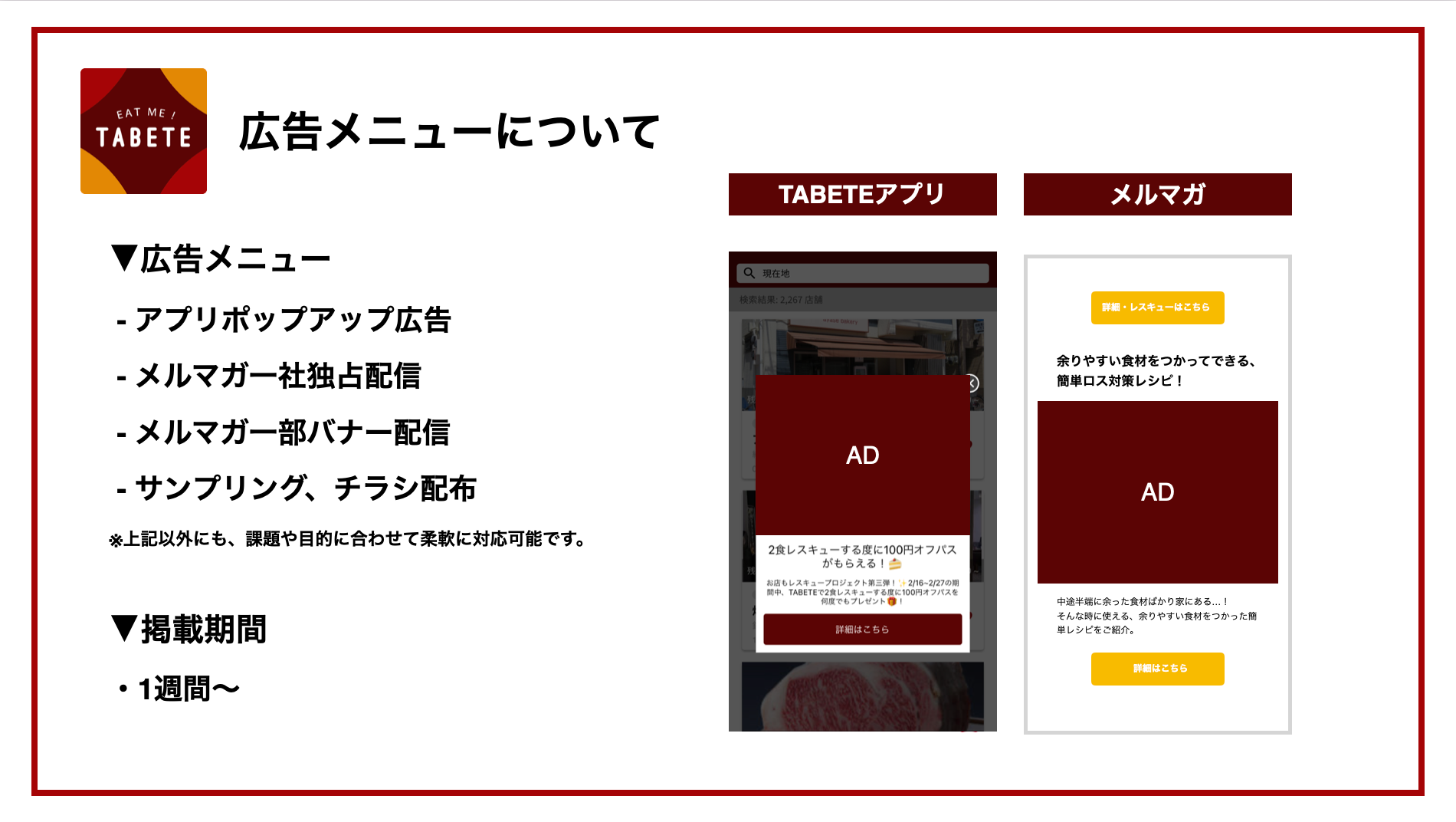 今回新たに提供を開始する広告事業では、TABETEアプリのTOP面に掲載可能なポップアップ広告枠、TABETE会員へのメルマガ配信枠、サンプリングなど、プロモーションの目的に合わせて柔軟に組み合わせてご提供可能。