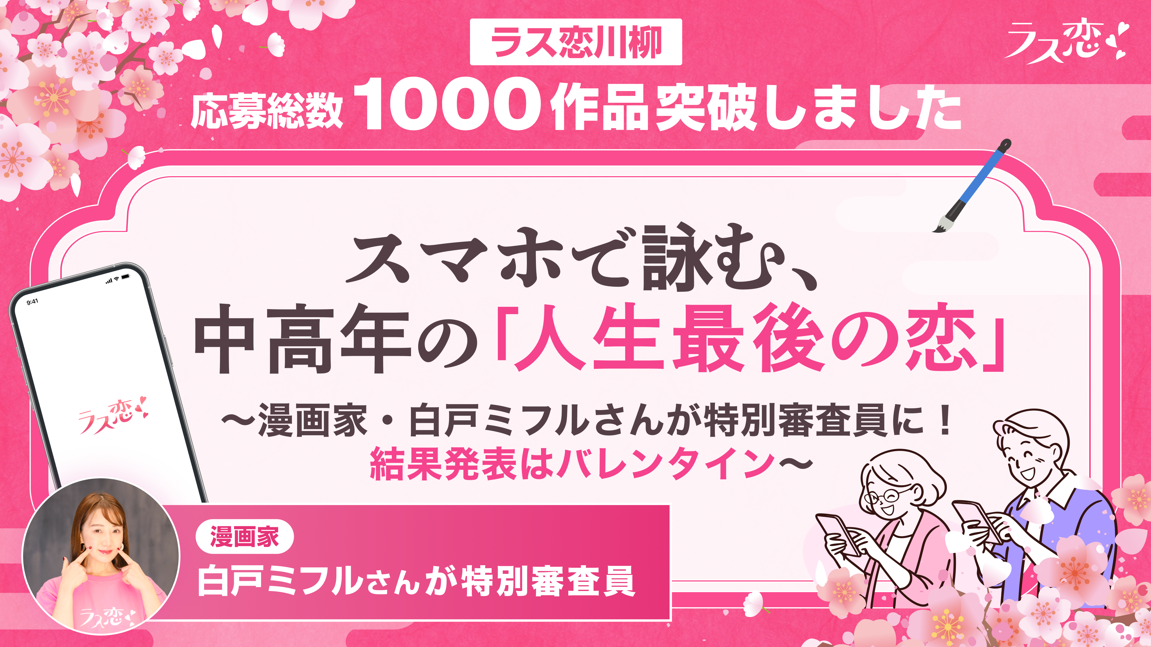 対象年齢が40歳以上の恋活・婚活マッチングアプリ「ラス恋」を運営する、株式会社ラス恋(アイザックグループ/本社 : 東京都渋谷区/代表取締役CEO : 山口 昂星)は、2025年12月23日より募集を開始した「第一回ラス恋川柳コンテスト」において、開始から3週間で応募作品数が1,000件を突破したことをお知らせします。