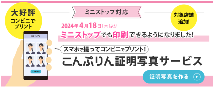 2022年より、お手持ちのスマートフォンやパソコンから画像を選んで証明写真を作り、コンビニで印刷できる「こんぷりん証明写真サービス」も開始しました。