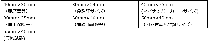 30mm×25mm (雇用保険等) | 60mm×40mm (看護師試験等) | 50mm×40mm (国外運転免許証サイズ) |