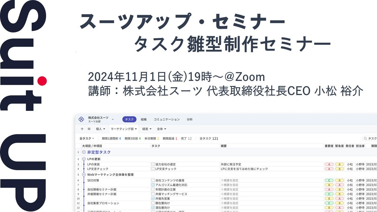 株式会社スーツ(所在地:東京都千代田区、代表取締役社長CEO:小松 裕介)は、2024年11月1日(金)19時から、当社代表の小松が講師を務めるスーツアップ・セミナー「タスク雛型制作セミナー」を無料開催します。