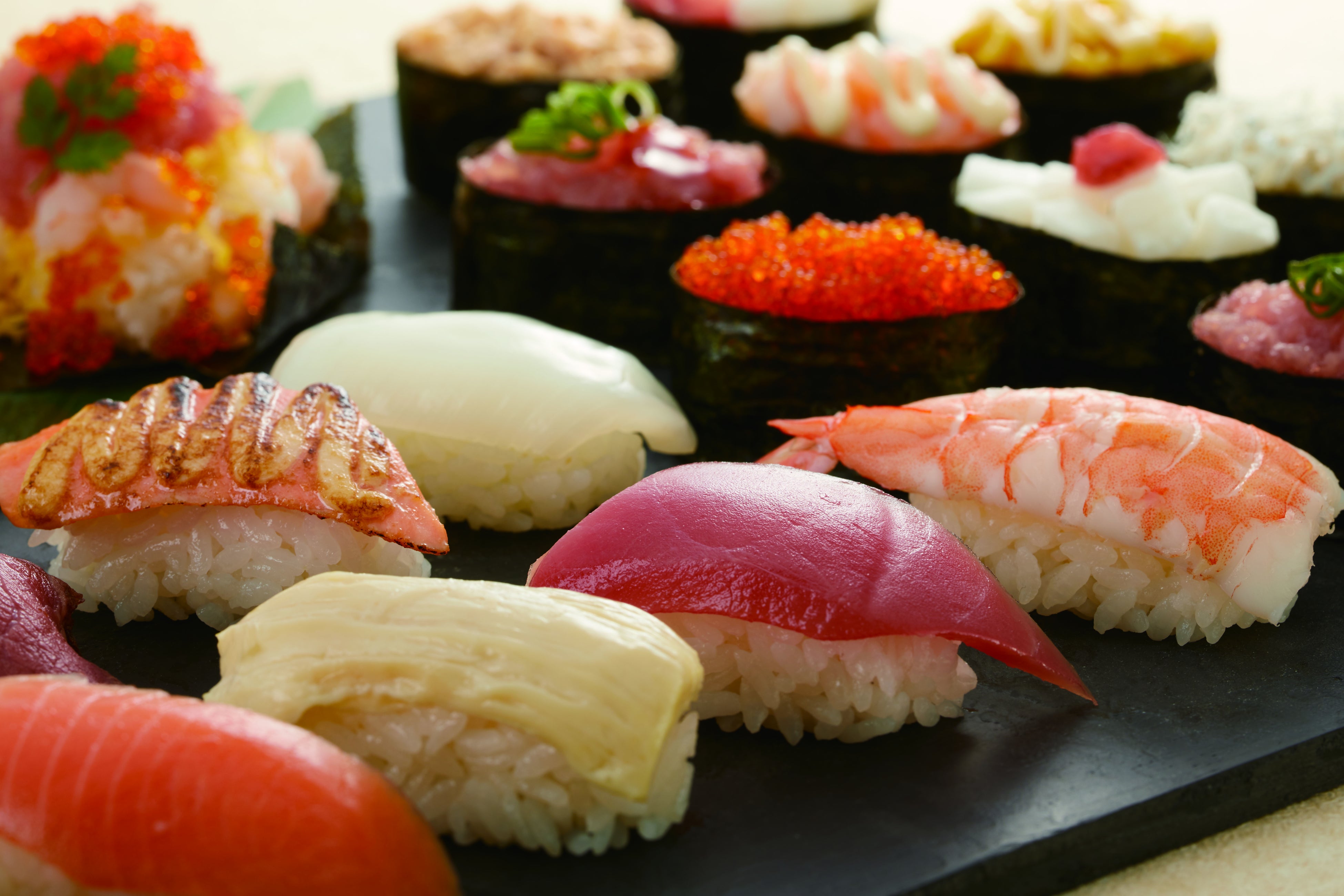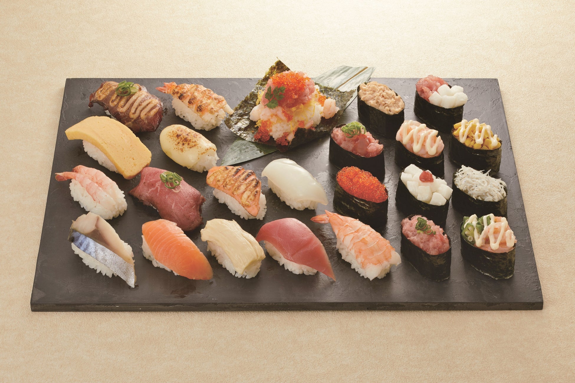 人気のサーモンにぎりやまぐろ、炙りマヨローストビーフのお寿司に加え、「炙りモッツァレラチーズ」のお寿司や「てんこ盛り寿司」など見た目にも楽しめるお寿司が仲間入り!!!
