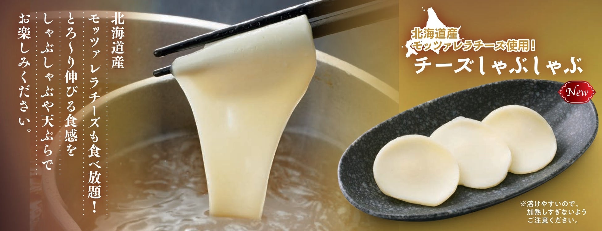- 北海道産国産牛スペシャルコースに「モッツァレラチーズ」の食べ放題「チーズしゃぶしゃぶ」が新登場!!