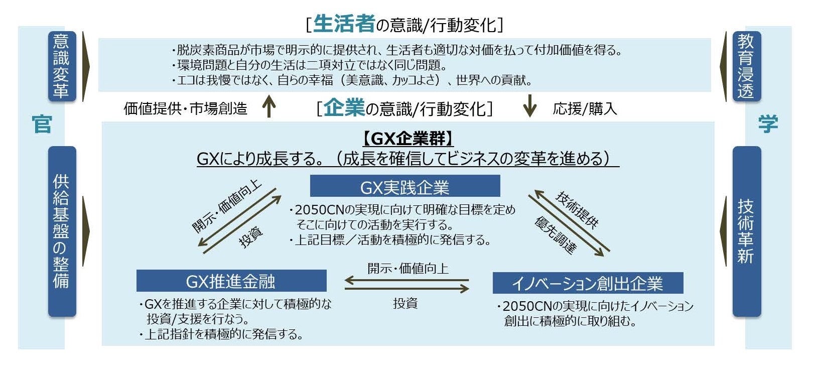 GXに積極的に取り組む「企業群」が、官・学・金でGXに向けた挑戦を行うプレイヤーと共に、一体として経済社会システム全体の変革のための議論と新たな市場の創造のための実践を行う場。