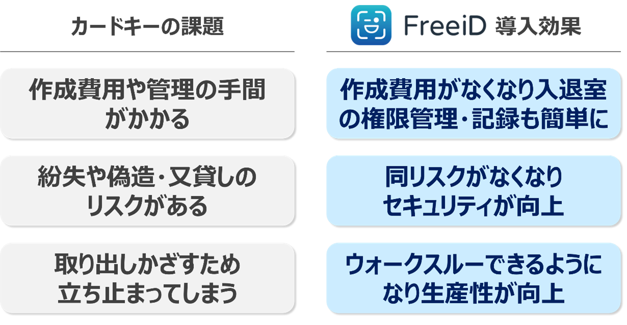 「FreeiD」の導入により、正確な本人確認ができる点で安全性や利便性が高まりました。出入口での解錠は顔をかざすだけなので、これまで通りスムーズな出入りが可能になります。鍵やカード等の管理は不要で、管理画面によって入退室の記録・管理も簡単なため、従業員の生産性向上とインシデントリスクの低減に寄与いたします。