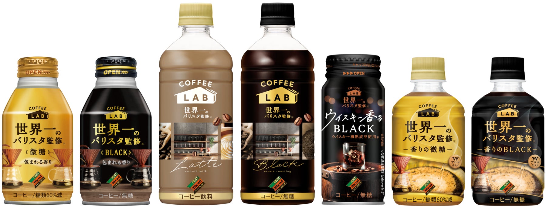 左から「ダイドーブレンド 微糖 コーヒーラボ 世界一のバリスタ監修」「ダイドーブレンド ブラック コーヒーラボ 世界一のバリスタ監修」「ダイドーブレンド ラテ コーヒーラボ 世界一のバリスタ監修」「ダイドーブレンド ブラック コーヒーラボ 世界一のバリスタ監修」「ダイドーブレンド ウイスキー香るブラック コーヒーラボ 世界一のバリスタ監修」「ダイドーブレンド 香りの微糖 コーヒーラボ 世界一のバリスタ監修」「ダイドーブレンド 香りのブラック コーヒーラボ 世界一のバリスタ監修」