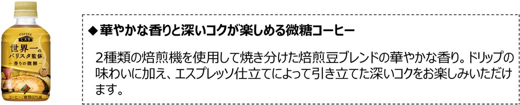 ダイドードリンコ株式会社(本社:大阪市北区、代表取締役社長:中島 孝徳)は、2024年春夏の新商品として、「ダイドーブレンド 香りの微糖 コーヒーラボ 世界一のバリスタ監修」「ダイドーブレンド 香りのブラック コーヒーラボ 世界一のバリスタ監修」を4月15日(月)より発売いたします。